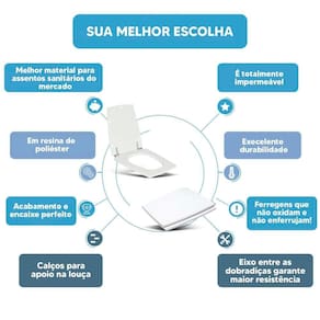 MATERIAL * Fabricado em Resina de Poliéster na cor Branca * É considerado o melhor material para assentos sanitários do mercado