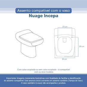 OBS.: O código 6LPF gravado na louça sanitária corresponde ao fluxo de água de uma descarga e não indica o modelo da mesma. RBN: Casa/Banho/Instalações e Acessórios de Banheiro/Vasos Sanitários e Peças/Assento de Vaso Sanitário | Conteúdo da Embalagem: 01 Assento Sanitário | Tipo: Assento Sanitário | Produto: Assento Sanitário | Site do Fabricante: www.ponttolavabo.com.br/ | Marca do Assento Sanitário: Pontto Lavabo | Garantia: 6 meses contra defeitos de fabricação | Dica: Instalação: sem desmontar o produto, posicione sobre o vaso sanitário e encaixe os dois parafusos com as borrachas pretas dentro do furo do vaso. Aperte com a chave de fenda no sentido horário até ficar firme. | Para Vaso Sanitário do Modelo: Nuage | Para vaso Sanitário da Marca: Incepa | Cor: Branco | Tonalidade: Branco | Material do Assento Sanitário: Poliéster | Instruções de Limpeza: Recomenda-se a limpeza com água e sabão neutro, não utilizar produtos abrasivos ou químicos | Almofadado?: Não | Peso do Produto: 2.98 | Tipo de Fechamento: Fechamento Comum | Material da Fixação: Alumínio Anodizado | Precisa de baterias ou pilhas: Não | Regulamentações aplicáveis a produtos perigosos: Não aplicável | Código de certificação: Não aplicável | Ponto de Destaque01: Produzido em 100% Resina de Poliéster, impermeável | Ponto de Destaque02: Ferragem em Alumínio Anodizado (não enferruja, não oxida) | Ponto de Destaque03: Possui 27cm de distância entre furos | Ponto de Destaque04: Produto vai completo, fácil instalação | Ponto de Destaque05: Pontto Lavabo | Termos de Pesquisa01: Assento Sanitário; Tampa de Vaso Sanitário; Nuage Branco Incepa; Nuage 6lpf; Incepa 6lpf | Quantidade de itens: 1 | Fonte de energia: Não aplicável | Dimensões da embalagem: Altura: 5cm x Largura: 40cm x Comprimento: 50cm | Número de caixas: 1