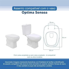 OBS.: O código 6LPF gravado na louça sanitária corresponde ao fluxo de água de uma descarga e não indica o modelo da mesma. RBN: Casa/Banho/Instalações e Acessórios de Banheiro/Vasos Sanitários e Peças/Assento de Vaso Sanitário | Conteúdo da Embalagem: 01 Assento Sanitário | Tipo: Assento Sanitário | Produto: Assento Sanitário | Site do Fabricante: www.ponttolavabo.com.br/ | Marca do Assento Sanitário: Pontto Lavabo | Garantia: 6 meses contra defeitos de fabricação | Dica: Instalação: sem desmontar o produto, posicione sobre o vaso sanitário e encaixe os dois parafusos com as borrachas pretas dentro do furo do vaso. Aperte com a chave de fenda no sentido horário até ficar firme. | Para Vaso Sanitário do Modelo: Optima | Para vaso Sanitário da Marca: Sensea | Cor: Branco | Tonalidade: Branco | Material do Assento Sanitário: Poliéster | Instruções de Limpeza: Recomenda-se a limpeza com água e sabão neutro, não utilizar produtos abrasivos ou químicos | Almofadado?: Não | Peso do Produto: 2.98 | Tipo de Fechamento: Fechamento Comum | Material da Fixação: Alumínio Anodizado | Precisa de baterias ou pilhas: Não | Regulamentações aplicáveis a produtos perigosos: Não se aplica | Código de certificação: Não se aplica Ean: 7899983692332