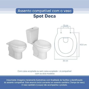 OBS.: O código 6LPF gravado na louça sanitária corresponde ao fluxo de água de uma descarga e não indica o modelo da mesma. RBN: Casa/Banho/Instalações e Acessórios de Banheiro/Vasos Sanitários e Peças/Assento de Vaso Sanitário | Conteúdo da Embalagem: 01 Assento Sanitário | Tipo: Assento Sanitário | Produto: Assento Sanitário | Site do Fabricante: | Marca do Assento Sanitário: Pontto Lavabo | : 6 meses contra defeitos de fabricação | Dica: Instalação: sem desmontar o produto, posicione sobre o vaso sanitário e encaixe os dois parafusos com as borrachas pretas dentro do furo do vaso. Aperte com a chave de fenda no sentido horário até ficar firme. | Para Vaso Sanitário do Modelo: Spot | Para vaso Sanitário da Marca: Deca | Cor: Branco | Tonalidade: Branco | Material do Assento Sanitário: Poliéster | Instruções de Limpeza: Recomenda-se a limpeza com água e sabão neutro, não utilizar produtos abrasivos ou químicos | Almofadado?: Não | Peso do Produto: | Tipo de Fechamento: Fechamento Comum | Material da Fixação: Alumínio Anodizado | Precisa de baterias ou pilhas: Não | Regulamentações aplicáveis a produtos perigosos: Não aplicável | Código de certificação: Não aplicável | Ponto de Destaque01: Produzido em 100% Resina de Poliéster, impermeável | Ponto de Destaque02: Ferragem em Alumínio Anodizado (não enferruja, não oxida) | Ponto de Destaque03: Possui 15cm de distância entre furos | Ponto de Destaque04: Produto vai completo, fácil instalação | Ponto de Destaque05: Pontto Lavabo | Termos de Pesquisa01: Assento Sanitário; Tampa de Vaso Sanitário; Spot Branco Deca; Spot 6lpf; Deca 6lpf | Quantidade de itens: 1 | Fonte de energia: Não aplicável | Dimensões da embalagem: Altura: 5cm x Largura: 40cm x Comprimento: 50cm | de caixas: 1