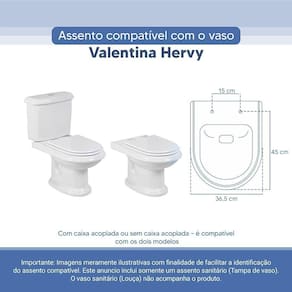 OBS.: O código 6LPF gravado na louça sanitária corresponde ao fluxo de água de uma descarga e não indica o modelo da mesma. RBN: Casa/Banho/Instalações e Acessórios de Banheiro/Vasos Sanitários e Peças/Assento de Vaso Sanitário | Conteúdo da Embalagem: 01 Assento Sanitário | Tipo: Assento Sanitário | Produto: Assento Sanitário | Site do Fabricante: | Marca do Assento Sanitário: Pontto Lavabo | : 6 meses contra defeitos de fabricação | Dica: Instalação: sem desmontar o produto, posicione sobre o vaso sanitário e encaixe os dois parafusos com as borrachas pretas dentro do furo do vaso. Aperte com a chave de fenda no sentido horário até ficar firme. | Para Vaso Sanitário do Modelo: Valentina | Para vaso Sanitário da Marca: Hervy | Cor: Branco | Tonalidade: Branco | Material do Assento Sanitário: Poliéster | Instruções de Limpeza: Recomenda-se a limpeza com água e sabão neutro, não utilizar produtos abrasivos ou químicos | Almofadado?: Não | Peso do Produto: | Tipo de Fechamento: Fechamento Comum | Material da Fixação: Alumínio Anodizado | Precisa de baterias ou pilhas: Não | Regulamentações aplicáveis a produtos perigosos: Não aplicável | Código de certificação: Não aplicável | Ponto de Destaque01: Produzido em 100% Resina de Poliéster, impermeável | Ponto de Destaque02: Ferragem em Alumínio Anodizado (não enferruja, não oxida) | Ponto de Destaque03: Possui 15cm de distância entre furos | Ponto de Destaque04: Produto vai completo, fácil instalação | Ponto de Destaque05: Pontto Lavabo | Termos de Pesquisa01: Assento Sanitário; Tampa de Vaso Sanitário; Valentina Branco Hervy; Valentina 6lpf; Hervy 6lpf | Quantidade de itens: 1 | Fonte de energia: Não aplicável | Dimensões da embalagem: Altura: 5cm x Largura: 40cm x Comprimento: 50cm | de caixas: 1