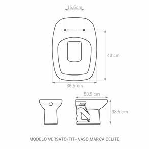 Tampa Vaso Versato Cinza Pérola Tampa Para Vaso Celite Mdf Cinza Escuro Assento Sanitário tampa de vaso fabricado em madeira MDF com pintura laqueada, com proteção raios UV, que garante excelente acabamento e durabilidade. Compatível com vasos bacias/louças sanitários com ou sem caixa acoplada. Tem calços de PVC instalados na tampa e no assento para proporcionar estabilidade ao uso, pois distribui o peso uniformemente sobre a louça sanitária. Montagem simples e fácil. Possui ferragem em alumínio anodizado que não enferruja/oxida e oferece muita resistência. O assento é acompanhado por parafusos para instalação. Embalagem dupla reforçada garante o recebimento do produto totalmente protegido. Especificações: - Dimensões da caixa: largura: 49,50cm. Altura: 4,00cm comprimento: 39,50cm - Peso do produto: 1,98kg - Acabamento: brilhante - Uso: este assento é adequado para uso na louça Celite modelo Versato - Garantia: 3 meses - Itens inclusos: Tampa e assento em MDF com calços de PVC, ferragem inoxidável, embalagem duplamente reforçada. Contém todos os parafusos e encaixes para instalação, sendo necessária somente uma chave de fenda para instalar o produto na louça sanitária. Instalação: posicione o produto, devidamente centralizado, em cima do vaso sanitário. Sem desmontar a ferragem, insira as buchas de borracha dentro dos furos da bacia sanitária. Encaixe os parafusos e posicione as porcas. Utilizando uma chave de fenda, aperte o parafuso no sentido horário até que o assento esteja firme e fixo no vaso. Manutenção: recomendamos a limpeza periódica com pano levemente umedecido com sabão neutro. Não usar esponjas abrasivas ou palha de aço nem qualquer tipo de produto químico. Ean: 7891467005089