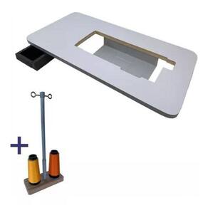 Esse móvel acompanha diversos itens para facilitar ainda mais o seu trabalho. Além do tampo de MDF, você também recebe uma base para apoio da máquina, uma gaveta plástica preta, um kit de parafusos para montagem e um exclusivo porta cone de linha. Tudo isso pensado para otimizar seu espaço de trabalho e tornar a sua experiência na costura ainda mais prazerosa.