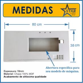 Tampo em MDF de 18mm revestido em PVC com fita métrica gravada. Possui abertura para armazenamento de bobinas e agulhas, suporte para dois cones de linha e gaveta plástica. Medidas do tampo: 80x38cm.Alça retrátil