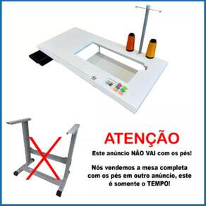 Tampo de MDF de 18mm revestido em PVC com acabamento perfeito. Possui abertura para armazenamento de bobinas e agulhas, suporte para dois cones de linha simultâneos e fita métrica gravada. Inclui base de apoio, hastes para cones, gaveta plástica e kit de parafusos.Funções
