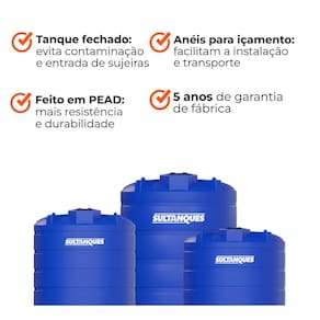 Tanque para armazenamento de água fabricado em polietileno 100% virgem, garantindo alta resistência e durabilidade. Possui tampa com vedação, fácil instalação e faces planas para adaptação de flanges. Ideal para uso residencial, agrícola, comercial e industrial.