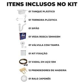 ITENS INCLUSOS 01 Tanque 01 Sifão 01 Torneira Plástica 01 Rolo de Fita Veda Rosca 12mm x 10m 01 Válvula Com tampa 06 Buchas S10 04 Parafusos 3,5 x 55mm 02 Parafusos 3,5 x 75mm 02 Espaçadores 02 Arruelas 01 Varal em Aço e PVC com 10 Metros 02 Presilhas Plásticas Para Travamento 12 Prendedores de Roupa em Madeira 01 Ralo em Inox 4,7cm Marca: Não Informado Ean: 7894141423407
