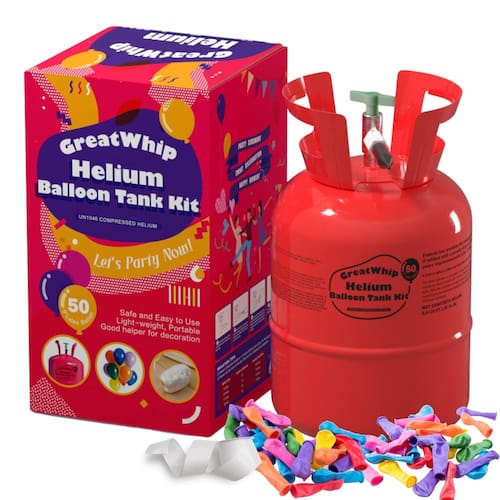 Tanque de hélio GreatWhip 13L, enche 50 balões de látex, tanque de hélio para balões em casa. Vem com 50 balões e fitas de látex.