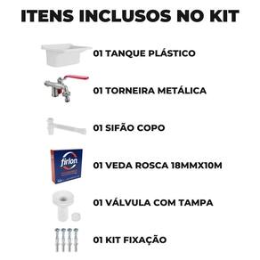 Tanque Plástico 34L Para Lavanderia Branco O uso do tanque de lavar roupa é ideal para lavagem de roupas delicadas, como roupas íntimas, de bebês e peças que requerem atenção especial, pois permite um controle mais preciso da temperatura e movimento das roupas durante a lavagem. Também é uma opção prática para pré-lavagem de roupas muito sujas antes de colocá-las em uma máquina de lavar. O tanque de lavar roupa é uma opção acessível e prática para quem deseja lavar roupas à mão sem abrir do conforto e da praticidade de um equipamento projeto para essa finalidade. ESPECIFICAÇÕES TÉCNICAS Material: Polipropileno Dimensões: 54 x 47 x 31,1cm Capacidade: Volume útil/total 20 / 34 Litros Locais Sugeridos: Lavanderias Acompanha Torneira: Não Acabamento: Brilhante Cor: Branco Torneira de Metal Para Jardim Quintal Tanque Com Bico 1/2 Esta torneira é fabricada em metal de alta qualidade, o que garante sua resistência à corrosão e a capacidade de resistir às condições climáticas adversas ao ar livre. Equipada com um bico de 1/2 e um único comando, será facil de operar e ajustar para atingir a pressão que você está procurando. O design ergonômico do punho facilita a abertura e o fechamento da torneira, tornando o uso confortável e prático. CARACTERÍSTICAS - Construção em metal durável e resistente à corrosão - Bico de 1/2 polegada para um fluxo de água controlável - Fácil instalação em sistemas de encanamento padrão - Design ergonômico para facilitar o uso - Versatilidade para uma variedade de aplicações em áreas externas FICHA TÉCNICA Modelo: Torneira de Aço 1/2 Uso: Jardins, quintais, tanques entre outros ambientes externos Material: Liga de zinco Tamanho do Bico: 1/2 Polegada Sifão Sanfonado Universal Com Copo 49cm Branco O sifão sanfonado universal com copo é um acessório essencial de encanamento, projetado para se adaptar a qualquer saída de válvula de pia e a qualquer tubulação de esgoto, independentemente de seu tamanho ou tipo. Além disso, o sifão sanfonado universal corrige possíveis desalinhamentos entre a cuba e a tubulação de despejo, evitando assim a formação de bloqueios e obstruções que possam causar vazamentos ou refluxo de água suja. Esse acessório é ideal para tanques, pias e cubas em banheiros, cozinhas e lavanderias. O copo, por sua vez, funciona como uma barreira para impedir que resíduos sólidos ou cabelos obstruem o fluxo de água. E também pode ser removido para facilitar sua limpeza, apenas rosqueado no seu sentido horário. Ele também é resistente a altas temperaturas, suportando água fria e quente até 90C, o que o torna adequado para ser em qualquer tipo de ambiente. Este sifão é compatível com tubos e conexões de 38, 40, 48 e 50mm, garantindo uma instalação fácil e segura, sem necessidade de ferramentas especiais. Ele é feito de plástico ABS de alta qualidade, o que o torna resistente a rachaduras, corrosão e vazamentos, garantindo sua durabilidade ao longo do tempo. Em resumo, o sifão sanfonado universal é uma solução confiável e prática para quem procura um acessório de encanamento que seja fácil de instalar e que possa se adaptar a diversas situações de encanamento. Sua capacidade de corrigir desalinhamentos e impedir o retorno de mau cheiro da tubulação de esgoto torna-o uma escolha inteligente e eficaz para garantir a segurança e higiene em sua casa ou negócio. ESPECIFICAÇÕES TÉCNICAS Material: Polipropileno Entrada Para Válvula Polegada : 7/8 Saída Para Tubos e Conexões: 38, 40, 48 e 50mm Modelo: Para pias, cubas, tanques, lavatórios e válvula americana Suporta temperatura até: 90 graus Cor: Branco Acabamento: Brilhante Manual de Instalação: Sim ITENS INCLUSOS 01 Tanque 01 Válvula Com tampa 06 Buchas S10 04 Parafusos 3,5 x 55mm 02 Parafusos 3,5 x 75mm 02 Espaçadores 02 Arruelas 01 Torneira de Metal 1/2 01 Sifão 01 Adaptador Universal 01 Rolo de Fita Veda Rosca 18mm x 10m