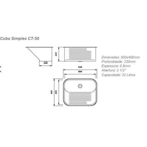 Medidas (CxLxP) 500x400x230mm em inox AISI 304 com 0,8mm de espessura.