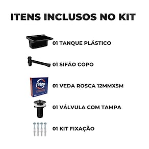 Tanque de plástico 34l para lavanderia preto + sifão copo universal sanfonado + fita veda rosca Tanque plástico 34l para lavanderia preto astra O uso do tanque de lavar roupa é ideal para lavagem de roupas delicadas, como roupas íntimas, de bebês e peças que requerem atenção especial, pois permite um controle mais preciso da temperatura e movimento das roupas durante a lavagem. Também é uma opção prática para pré-lavagem de roupas muito sujas antes de colocá-las em uma máquina de lavar. O tanque de lavar roupa é uma opção acessível e prática para quem deseja lavar roupas à mão sem abrir do conforto e da praticidade de um equipamento projeto para essa finalidade. Especificações técnicas Material: polipropilen Dimensões: 54 x 47 x 31,1cm Capacidade: volume útil/total 20 / 34 litros Locais sugeridos: lavanderias Acompanha torneira: não Acabamento: brilhante Marca: astra Cor: preto Sifão sanfonado universal com copo 49cm perto astra O sifão sanfonado universal com copo astra é um acessório essencial de encanamento, projetado para se adaptar a qualquer saída de válvula de pia e a qualquer tubulação de esgoto, independentemente de seu tamanho ou tipo. Além disso, o sifão sanfonado universal astra corrige possíveis desalinhamentos entre a cuba e a tubulação de despejo, evitando assim a formação de bloqueios e obstruções que possam causar vazamentos ou refluxo de água suja. Esse acessório é ideal para tanques, pias e cubas em banheiros, cozinhas e lavanderias. Especificações técnicas Material: polipropileno Entrada para válvula polegada : 7/8 Saída para tubos e conexões: 38, 40, 48 e 50mm Modelo: para pias, cubas, tanques, lavatórios e válvula americana Suporta temperatura até: 90 graus Cor: preto Acabamento: brilhante do fabricante: 90 dias Manual de instalação: sim Fita veda rosca teflon 12mm x 5m firlon Fita veda rosca teflon firlon é produzida pela plastifluor que líder de produção para o mercado brasileiro. Produto com excelência em qualidade, supera a norma abnt nbr 16368:2015. Especificações técnica Composição química: ptfe poli-tetra-fluor-etileno . Aplicação: vedação de roscas e conexões em tubulações de água fria, água quente, vapor, combustíveis, fluidos e gases em geral. Temperatura de trabalho: de - 90c até +240c. Resistência química: material de baixíssima reatividade química, resistente aos líquidos e gases comumente utilizados em instalações industriais como: ácidos, bases, solventes, combustíveis, lubrificantes, vapor, gases de processo etc. Compatibilidade com oxigênio: compatível com oxigênio líquido ou gasoso em temperatura ambiente e criogênicas. Consultar quanto ao uso acima de 50c. Tolerâncias dimensionais: sempre maior ou igual que a espessura e densidade mínima. Marca: firlon Fabricante: plastifluor Comprimento: 5 metros Largura: 12 milímetros O kit segue com todos os itens para montagem e pronto para uso após a instalação - 90 dias para o tanque - 90 dias para o sifão Itens inclusos 01 tanque 01 sifão 01 rolo de fita veda rosca 12mm x 5m 01 válvula com tampa 06 buchas s10 04 parafusos 3,5 x 55mm 02 parafusos 3,5 x 75mm 02 espaçadores 02 arruelas