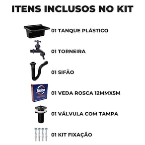 Tanque de plástico 34l para lavanderia preto + sifão universal sanfonado + fita veda rosca + torneira reforçacada Tanque plástico 34l para lavanderia preto astra O uso do tanque de lavar roupa é ideal para lavagem de roupas delicadas, como roupas íntimas, de bebês e peças que requerem atenção especial, pois permite um controle mais preciso da temperatura e movimento das roupas durante a lavagem. Também é uma opção prática para pré-lavagem de roupas muito sujas antes de colocá-las em uma máquina de lavar. O tanque de lavar roupa é uma opção acessível e prática para quem deseja lavar roupas à mão sem abrir do conforto e da praticidade de um equipamento projeto para essa finalidade. Especificações técnicas Material: polipropilen Dimensões: 54 x 47 x 31,1cm Capacidade: volume útil/total 20 / 34 litros Locais sugeridos: lavanderias Acompanha torneira: não Acabamento: brilhante Marca: astra Cor: preto Sifão sanfonado universal 61cm preto astra O sifão sanfonado universal astra é um acessório essencial de encanamento, projetado para se adaptar a qualquer saída de válvula de pia e a qualquer tubulação de esgoto, independentemente de seu tamanho ou tipo. Além disso, o sifão sanfonado universal astra corrige possíveis desalinhamentos entre a cuba e a tubulação de despejo, evitando assim a formação de bloqueios e obstruções que possam causar vazamentos ou refluxo de água suja. Esse acessório é ideal para tanques, pias e cubas em banheiros, cozinhas e lavanderias. Especificações técnicas Material: polipropileno Entrada para válvula polegada : 7/8 Saída para tubos e conexões: 38, 40, 48 e 50mm Modelo: para pias, cubas, tanques, lavatórios e válvula americana Suporta temperatura até: 90 graus Cor: preto Acabamento: brilhante do fabricante: 90 dias Torneira plástica em pvc para jardim tanque pia com 1/2 polegada A torneira para lavatório possui o volante anatômico, que facilita a abertura e o fechamento, o plástico abs com proteção uv, e a durabilidade e a qualidade sempre presente nos produtos em nossos produtos. Fácil instalação, maior praticidade e durabilidade. Especificações técnicas Largura: 10cm Altura: 13,5cm Diâmetro: 12,7cm 1/2 Material: plástico pvc O kit segue com todos os itens para montagem e pronto para uso após a instalação - 90 dias para o tanque - 90 dias para o sifão - 30 dias para a torneira Itens inclusos 01 tanque 01 sifão 01 torneira plástica reforçada 1/2' 01 rolo de fita veda rosca 12mm x 5m 01 válvula com tampa 06 buchas s10 04 parafusos 3,5 x 55mm 02 parafusos 3,5 x 75mm 02 espaçadores 02 arruelas