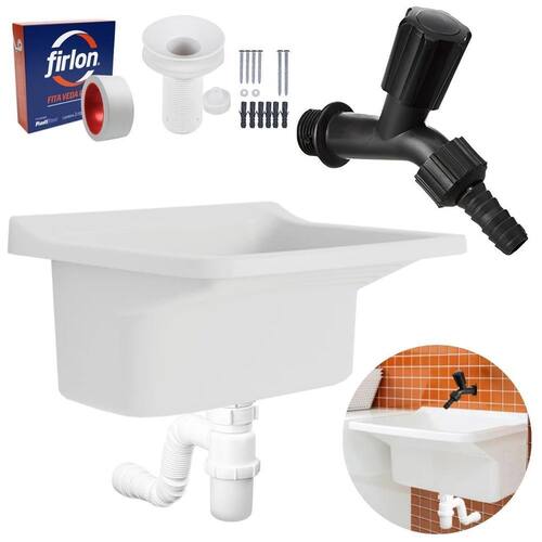 Tanque de plástico 40l para lavanderia branco + sifão copo universal sanfonado + fita veda rosca + torneira