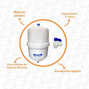 Tanque Reservatório Pressurizado para Osmose Reversa - 11 Litros 3.0 G Informações do Produto Reservatório pressurizado que possui um diafragma interno para aumentar a pressão da água e sua vazão em sistemas de Osmose Reversa. Capacidade interna é de 60 a 70% do seu volume nominal. Especificações do Produto - Volume nominal: 11 litros 3.0 galões - Volume útil: 7 litros - Diâmetro externo: 25 cm - Altura: 37 cm - Peso: 1,8 Kg - Conexão 1/4 - Cor: Branca - Material: plástico Marca: Não Informado Ean: 7893199399528