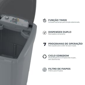A função Timer garante o controle ideal de cada ciclo, ajustando o tempo conforme a necessidade de cada tipo de roupa. Já o Dispenser Duplo do Tanquinho Britânia assegura a dosagem correta de sabão e amaciante, proporcionando resultados impecáveis e tecidos mais macios ao toque.