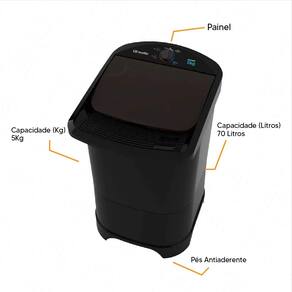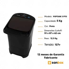 Especificações Técnicas: -Marca: Mueller -Modelo: Lavadora POPTANK 5 PTO 127V -EAN: 7896664602147 -Cor: Preto -Tipo: Tanquinho -Abertura: Superior -Capacidade (Kg): 5 -Capacidade de água na cuba (Nível máximo litros): 70 L -Capacidade de Lavagem (Kg): 5Kg -Capacidade de Secagem (Kg): 0Kg -Consumo de energia Ciclo normal água fria (kW/h): 0,08 -Desmontável: Sim -Dispenser para Sabão: Sim -Engates p/ Mangueira: Sim -Entrada de Água: Manual -Enxágue: Manual -Esfregador: Com apoio para sabão -Filtro para Fiapos: Por coluna d'água -Gabinete: Plástico especial -Grade de Proteção no Motor: Sim -Mangueira de entrada de água: Sim -Motor com Protetor Térmico: Sim -Níveis de Água: 0 -Número de Programas: 4 -Pegador para Transporte: Não -Peneira para Pequenos Objetos: Sim -Pés: Fixos -Potência 127V (watts): 281w -Saída de Água: Manual -Sistema de Lavagem: Turbilhonamento -Tampa transparente: Sim -Classificação Eficiência Energética: A -Tensão: 127v -Dimensões (L x A x C): 51 x 87 x 62 cm -Peso: 12,5 kg -Peso Bruto: 14,2 Kg