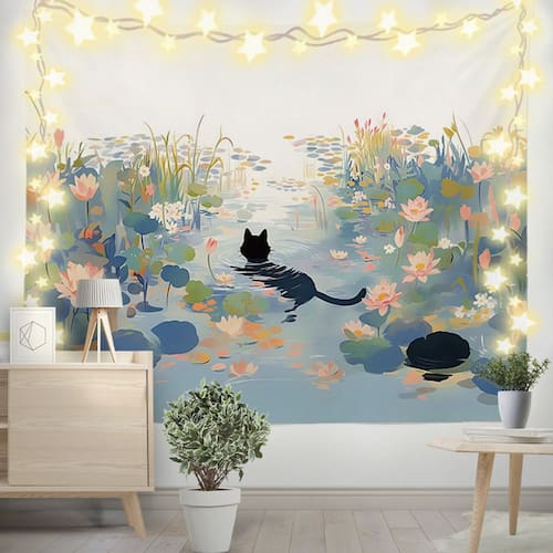 Material: pelúcia curta Tamanho: 150 cm × 130 cm Peso: 290 g Design charmoso para gatos — Apresenta um gato preto brincalhão nadando em um lago de lótus com flores coloridas, trazendo uma atmosfera caprichosa e relaxante a qualquer ambiente. Tecido macio de pelúcia curta — Feito de pelúcia curta de alta qualidade, macio, aconchegante, durável e resistente a rugas para uso decorativo diário. Decoração artística de parede versátil — funciona perfeitamente como tapeçaria, tapeçaria, decoração de dormitório, colcha, capa de sofá ou pano de fundo para fotografia estética. Fácil de pendurar e manter — Bordas reforçadas para maior durabilidade; leve, dobrável, lavável à máquina em água fria e de secagem rápida. Tamanho médio perfeito — mede 150 x 130 cm (59 x 51 polegadas), ideal para dormitórios, quartos ou salas de estar, criando uma atmosfera fofa no estilo anime.