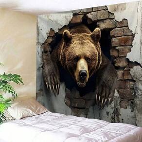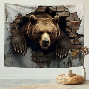 Material: fibra de poliéster (poliéster) Tamanho: 150 cm × 130 cm Peso: 260 g Design impressionante de urso em 3D: apresenta um urso pardo realista rompendo uma parede rachada, criando um efeito ousado e realista para uma decoração dramática de arte de parede. Tecido de poliéster durável: feito de material de poliéster de alta qualidade com impressão digital vívida, garantindo cores brilhantes e uso duradouro. Decoração versátil: tapeçaria perfeita para quarto, sala de estar, dormitório ou espaço de entretenimento temático, adicionando uma estética única da natureza selvagem. Fácil de pendurar e manter: o tecido leve é simples de instalar com ganchos ou clipes; lavável à máquina ou à mão para facilitar a limpeza. Tamanho decorativo generoso: a tapeçaria de 150x130cm oferece excelente cobertura, transformando paredes simples em exibições atraentes com arte inspirada em animais.
