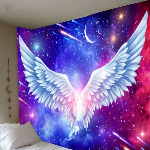 Material: fibra química Tamanho: 150 cm × 130 cm Peso: 200 g Ethereal Angel Wings Design — Apresenta um impressionante par de asas luminosas colocadas contra o fundo de uma galáxia estrelada, adicionando uma atmosfera mística e edificante a qualquer ambiente. Tapeçaria de parede versátil — funciona como tapeçaria, decoração de parede, colcha ou pano de fundo, ideal para salas de estar, dormitórios, espaços de meditação e estúdios criativos. Tecido de poliéster de alta qualidade — O tecido de pele de pêssego durável, leve e de toque suave garante cores duradouras e um caimento suave para uma aparência premium. Fácil de instalar e manter — vem com bordas reforçadas e pode ser pendurado com alfinetes, clipes ou ganchos; lavável à máquina e resistente ao desbotamento para facilitar o cuidado. Tamanho perfeito e ajuste estético — mede 150 cm x 130 cm, o que o torna adequado para uma parede característica ou como pano de fundo para rituais espirituais, relaxamento ou decoração estética.