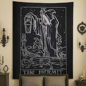 Material: pele de pêssego Tamanho: 150 cm × 130 cm Peso: 260 g Design de tarô místico — apresenta a ilustração da carta de tarô Hermit com lanterna, manto e imagens simbólicas, perfeita para amantes da arte gótica e espiritual. Tecido premium — Feito de material macio de pele de pêssego, leve, durável e confortável, com impressão nítida em preto e branco para cores duradouras. Decoração artística de parede versátil — funciona como tapeçaria, tapeçaria de parede, pano de fundo de meditação ou decoração estética para quarto, sala de estar ou dormitório. Fácil de usar e manter — Pode ser pendurado facilmente com pinos ou fitas adesivas; dobra-se perfeitamente para armazenamento e é lavável à máquina para facilitar o cuidado. Tamanho grande — mede 150 x 130 cm (59 x 51 polegadas), adequado como arte de parede marcante para aprimorar interiores góticos, bruxos ou boho.