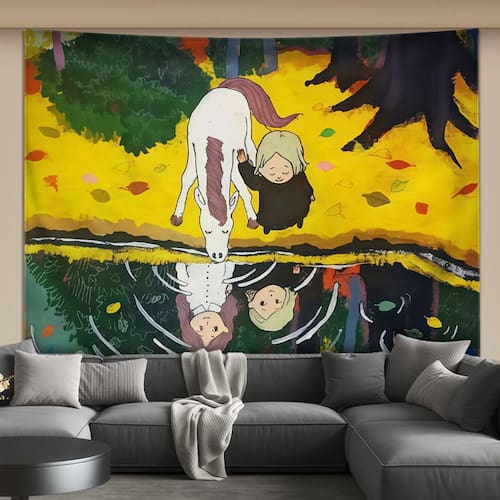 Material: pelúcia Tamanho: 150 cm × 130 cm Peso: 260 g Design de desenho animado encantador: apresenta uma garota com seu cavalo à beira do lago da floresta, com um efeito de reflexão sonhador, adicionando um toque caprichoso e reconfortante à decoração de sua parede. Tecido de pelúcia macio: feito de material de pelúcia aconchegante, oferecendo uma textura suave, durabilidade e cores vivas que aprimoram a estética geral do seu quarto. Decoração artística de parede versátil: perfeita para quartos, salas de estar, dormitórios e espaços criativos, tornando-a uma adição deliciosa a quartos infantis ou interiores divertidos. Fácil de pendurar e manter: projetada com bordas bem costuradas, esta tapeçaria pode ser montada rapidamente com ganchos ou clipes e é lavável à máquina para facilitar o cuidado. Tamanho generoso: medindo 59 x 51 polegadas, oferece ampla cobertura de parede, funcionando como decoração de parede, pano de fundo ou peça de destaque para enriquecer qualquer espaço aconchegante ou de inspiração nórdica.