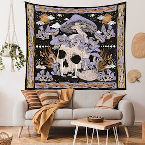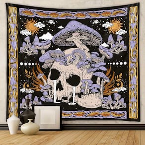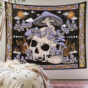 Material: flanela Tamanho: 130 cm × 150 cm Peso: 290 g Design gótico psicodélico — apresenta uma ilustração ousada de caveira com cogumelos, sóis, luas e elementos cósmicos, criando uma atmosfera misteriosa e atraente. Material de tecido macio — Feito de tecido de pelúcia de alta qualidade que é macio, durável e leve, com impressão vívida de alta definição para cores duradouras. Decoração artística de parede versátil — perfeita como tapeçaria, decoração artística de parede ou pano de fundo para quartos, dormitórios, apartamentos e salas de estar com estética gótica ou alegre. Fácil de pendurar e manter — O design leve permite pendurar facilmente com ganchos ou pregos; dobrável para armazenamento e lavável na máquina em um ciclo delicado. Tamanho grande — mede 150 x 130 cm, adequado para ampla cobertura de parede e transforma espaços em pontos focais dramáticos para homens, mulheres e adolescentes.