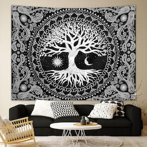 Material: pelúcia curta Tamanho: 150 cm × 130 cm Peso: 300 g Design elegante da Árvore da Vida — Impressionante tapeçaria em preto e branco com uma árvore detalhada com elementos do sol e da lua, cercada por intrincados padrões de mandala. Material de pelúcia macio — Feito de tecido de pelúcia curto de alta qualidade, macio e confortável ao toque, com impressão nítida e resistência a rugas para uso a longo prazo. Tamanho decorativo perfeito — mede 150 x 130 cm, ideal para decoração de paredes em quartos, salas de estar, áreas de meditação ou dormitórios, criando uma atmosfera boho pacífica. Fácil de pendurar e cuidar — Leve e simples de montar usando ganchos, clipes ou fitas adesivas. Lavável à máquina em água fria e de secagem rápida para facilitar a reutilização. Decoração boêmia versátil — Adequada como decoração de parede, divisória de quarto, pano de fundo de espaço de meditação ou colcha decorativa, adicionando um toque espiritual a qualquer espaço.