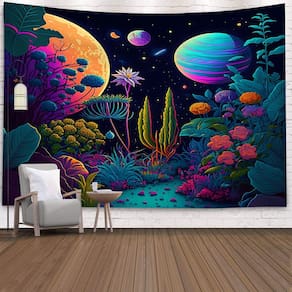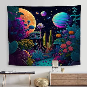 Material: fibra de poliéster (poliéster) Tamanho: 150 cm × 130 cm Peso: 190 g Design cósmico vibrante: apresenta uma cena fantástica de jardim de galáxias com planetas, flores e plantas brilhantes, criando uma atmosfera sonhadora e psicodélica para a decoração de sua parede. Material de alta qualidade: feito de tecido leve de poliéster que é macio, durável e resistente ao desbotamento, garantindo cores vivas de longa duração. Decoração multiuso: perfeita como tapeçaria, tapeçaria de parede ou cenário estético para quartos, salas de estar, dormitórios ou estúdios criativos. Fácil de pendurar e limpar: equipado com bordas perfeitas para pendurar com segurança. Lavável à máquina em ciclo delicado ou à mão para facilitar a manutenção. Tela de tamanho médio: medindo 59 x 51 polegadas, esta tapeçaria é ideal para decoração de arte de parede, criando um ponto focal impressionante sem sobrecarregar seu espaço.
