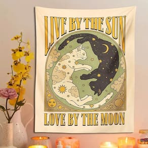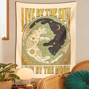 Embalagem: 1 x Tapeçaria Material: poliéster Tamanho: 100X150 cm Peso: 110g Esta tapeçaria “Live by the Sun, Love by the Moon” traz um toque sereno e místico ao seu quarto, apresentando um gato branco e preto em um design celestial com estrelas, nuvens e os símbolos do sol e da lua. Feita de tecido 100% poliéster, esta tapeçaria é macia, durável e não agride a pele. Tem uma cortina de alta qualidade quando pendurada na parede, criando uma atmosfera aconchegante e relaxante em seu quarto ou sala de estar. A tapeçaria apresenta tecnologia de impressão de alta definição para garantir que as cores vibrantes e os detalhes intrincados permaneçam vivos ao longo do tempo. O design celestial adiciona beleza e energia espiritual ao seu espaço. Leve e sem moldura, esta tapeçaria é fácil de pendurar usando tachas decorativas ou alfinetes. Também é fácil de dobrar, guardar e cuidar, o que o torna uma adição conveniente e prática à decoração da sua casa. Um presente perfeito para quem gosta de astrologia, gatos ou decoração espiritual. Esta tapeçaria adiciona uma atmosfera pacífica e mágica a qualquer ambiente, tornando-a um presente atencioso para a família, amigos ou para você mesmo.