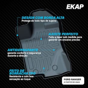 Especificações: -Marca: Ekap - Indicado para o veículo: Ranger; - Versões aplicáveis: 2019 a 2025; - Material: borracha TPO flexível e resistente; - Formato: bandeja com bordas altas; - Resistência: à água, poeira, lama e produtos químicos leves; - Instalação: acoplamento no assoalho sem necessidade de ferramentas;