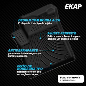 Especificações: - Marca: Ekap - Indicado para o veículo: Terrytory; - Versões aplicáveis: 2020 a 2025; - Material: borracha TPO flexível e resistente; - Formato: bandeja com bordas altas; - Resistência: à água, poeira, lama e produtos químicos leves; - Instalação: acoplamento no assoalho sem necessidade de ferramentas;