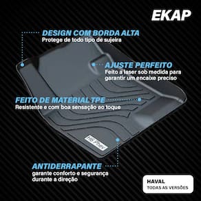 Especificações: - Marca : Ekap - Indicado para o veículo: Haval; - Versões aplicáveis: Todas as versões; - Material: borracha TPO flexível e resistente; - Formato: bandeja com bordas altas; - Resistência: à água, poeira, lama e produtos químicos leves; - Instalação: acoplamento no assoalho sem necessidade de ferramentas;