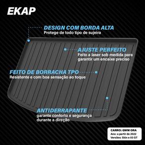 Especificações: - Marca: Ekap - Indicado para o veículo: Ora; - Versões aplicáveis: Todas as versões; - Material: borracha TPO flexível e resistente; - Formato: bandeja com bordas altas; - Resistência: à água, poeira, lama e produtos químicos leves; - Instalação: acoplamento no assoalho sem necessidade de ferramentas;
