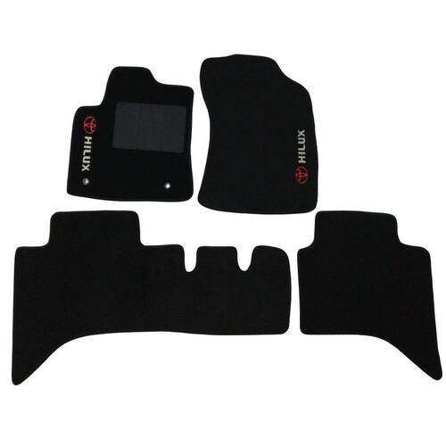 Tapete Automotivo Carpete Linha Luxo Toyota Hilux Jogo de tapete linha grify luxo carpete com espessura de 11 mm na cor preta com base antiderrapante em pvc pinado. Bordado com a grafia e nome, lavável. Jogo com 5 peças. O jogo de tapete linha grify luxo carpete produzido pela Tapecars, possui um design exclusivo e com acabamento perfeito no seu carro, carpete em pelo alto com 11mm de espessura vem com acabamento nas laterais na cor preta, e com grafia bordada em 3D nos 02 tapetes dianteiros e bordado também no túnel com a grafia da montadora. Vem com tiras aderentes costurado nas duas peças dianteiras para sua maior segurança e melhor fixação do produto. Esse jogo é um produto com excelente qualidade, com 05 peças e o tapete do motorista vem com um pisante em pvc para segurança do motorista, evitando que escorregue. Cor disponível - Preto Especificação técnica do produto - Jogo composto com 5 peças - Carpete de ótima qualidade com 11 mm - Base em pvc pinado antiderrapante - Fabricado em polipropileno - Grafia bordada igual ao da montadora - Pisante em pvc no tapete do motorista - tiras aderentes costurado nas 2 peças dianteiras - Bordado lateral nas 2 peças dianteiras - Bordado no túnel traseiro - Tapete lavável e impermeável - Proteção anti-chamas - Encaixe perfeito e sob medida Conteúdo da embalagem - 02 Tapetes dianteiros - 02 Tapetes traseiros - 01 Tapete central - 03 Meses Importante - Valor do jogo - Não nos responsabilizamos por mau uso do produto - Imagens meramente ilustrativas Marca: Não Informado