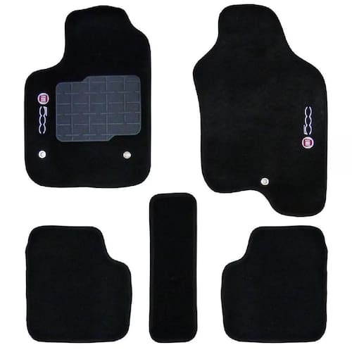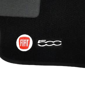 Tapete Automotivo Fiat 500 Carpete Luxo Jogo de tapete linha Luxo carpete com espessura de 11mm na cor preta com base antiderrapante em pvc pinado. Bordado com a grafia e nome, lavável. Jogo com 5 peças.