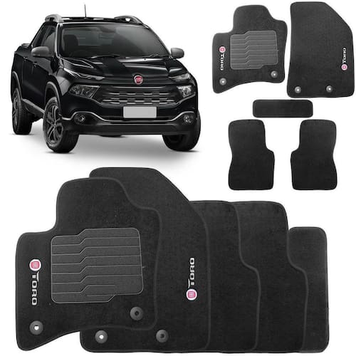 Tapete Automotivo Fiat Toro Carpete Linha Luxo Jogo de tapete linha grify luxo carpete com espessura de 11 mm na cor preta com base antiderrapante em pvc pinado. Bordado com a grafia e nome, lavável. Jogo com 5 peças. O jogo de tapete linha grify luxo carpete produzido pela Tapecars, possui um design exclusivo e com acabamento perfeito no seu carro, carpete em pelo alto com 11mm de espessura vem com acabamento nas laterais na cor preta, e com grafia bordada em 3D nos 02 tapetes dianteiros e bordado também no túnel com a grafia da montadora. Vem com tiras aderentes costurado nas duas peças dianteiras para sua maior segurança e melhor fixação do produto. Esse jogo é um produto com excelente qualidade, com 05 peças e o tapete do motorista vem com um pisante em pvc para segurança do motorista, evitando que escorregue. Cor disponível - Preto Especificação técnica do produto - Jogo composto com 5 peças - Carpete de ótima qualidade com 11 mm - Base em pvc pinado antiderrapante - Fabricado em polipropileno - Grafia bordada igual ao da montadora - Pisante em pvc no tapete do motorista - tiras aderentes costurado nas 2 peças dianteiras - Bordado lateral nas 2 peças dianteiras - Bordado no túnel traseiro - Tapete lavável e impermeável - Proteção anti-chamas - Encaixe perfeito e sob medida Conteúdo da embalagem - 02 Tapetes dianteiros - 02 Tapetes traseiros - 01 Tapete central - 03 Meses Importante - Valor do jogo - Não nos responsabilizamos por mau uso do produto - Imagens meramente ilustrativas Marca: Não Informado