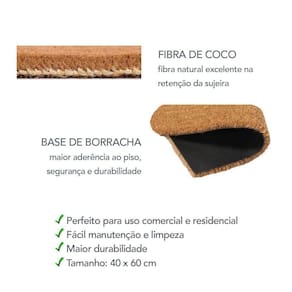 Capacho em fibra de coco e base de borracha. O capacho possui base emborrachada, garantindo resistencia, durabilidade e maior aderencia ao piso. Os capachos em fibra de coco sao tapetes de alta qualidade, super resistentes e fabricados com fibra natural. Indicados para uso residencial e comercial, possuem maior retençao da sujeira e facil manutençao. Para limpeza, basta aspirar o pó e a sujeira. Evitem molhar e manter as fibras umidas.