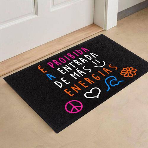 Tapete Capacho É Proibida A Entrada De Más Energias 80X60Tapete É Proibida A Entrada De Más Energias 60x40cmTapete É Proibida a Entrada de Más EnergiasTapete decorativo para sua casa.Características:Tamanho: 80 Cm X 60 CmMaterial: VinilPersonalização: PintadoCor Do Fundo: PretoBorda: Rebaixada 2cmCor Do Logo: Laranja, pink, azul claro, branco Marca: Endereço Do Kapacho