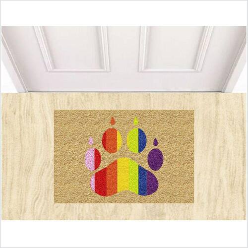 Tapete tipo Capacho Vinil com fibras entrelaçadas e costado emborrachado com arte pinta em tinta vinílica especial.
