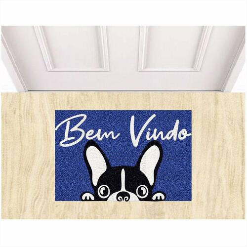Tapete Capacho Vinil Bem vindo Bulldog Pets Para Decoração. - Cor.: Azul royal
