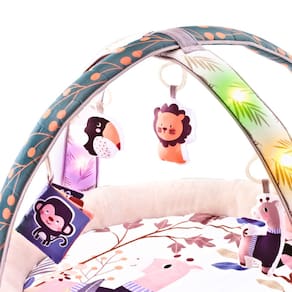 Este tapete para bebê não é apenas um espaço seguro para brincar, mas uma verdadeira ferramenta de desenvolvimento! Seu arco está equipado com 5 adoráveis brinquedinhos de pelúcia de animais, cada um com papel de ruído para estimular os sentidos do bebê.