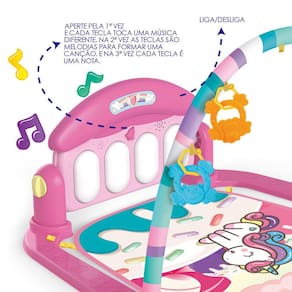 Características: - O piano acompanha o crescimento do bebê com músicas e interação - Percepção visual: reconhecimento de diferentes formas e cores - Desenvolvimento tátil: os brinquedos pendurados e o piano na base promovem o desenvolvimento muscular dos braços e pernas do bebê - Coordenação motora: aos 6 meses o bebê já começa a ficar sentado, treinando a capacidade motora e flexibilidade com os brinquedos - Desenvolvimento auditivo: as teclas do piano tocam diferentes sons e melodias, estimulando a audição dos pequenos - Funções de Liga / Desliga