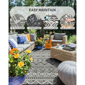 Quatro tamanhos disponíveis: 5 x 8 pés, 6 x 9 pés, 9 x 12 pés, 9 x 18 pés Três cores disponíveis: cinza, azul marinho, preto marrom, marrom bege Tapete versátil para uso interno e externo que pode ser amplamente utilizado como tapete de pátio, tapete de trailer, tapetes de acampamento para fora do trailer, tapetes de deck para uso externo à prova d'água. Tapete Boho ao ar livre como ótima decoração de pátio, decoração de varanda, decoração de varanda externa, decoração de deck ao ar livre, decoração de acampamento para campista. Tapete externo impermeável e barato que o campista deve ter e os acessórios de praia essenciais - Reversível e versátil: um tapete reversível intercambiável e econômico oferece cor e personalidade ao seu espaço interno e externo sem distrair de outras decorações. O tapete Boho com design geométrico moderno e versátil pode ser uma ótima decoração de pátio externo, decoração de varanda. - Resistente a manchas e secagem rápida: tapete de palha de plástico reciclado para exterior de fácil limpeza, impermeável, resistente a manchas e de secagem rápida. Sujeira, cabelo e respingos podem ser facilmente removidos por pulverização ou agitação de água. Opções perfeitas para serem colocadas ao ar livre o tempo todo, como tapete de pátio externo, tapete de varanda ou tapete de piscina ao ar livre. Também é um tapete de praia impermeável sem areia, tapete de acampamento ao ar livre, tapete de piquenique ou tapetes para trailers ao ar livre. - Durável e resistente ao desbotamento: o revestimento UV externo do tapete reduz os possíveis danos causados pela luz solar, como desbotamento ou envelhecimento. A borda termoplástica com encadernações pode evitar desgaste e rasgos. Tapete externo à prova de intempéries que sobrevive a qualquer elemento, tráfego e arranhões sem perder sua cor ou textura com o tempo. - Macio e confortável: o tapete externo, tecido com canudos de plástico tubulares e antialérgicos, é macio e acolhedor sob os dedos dos pés e joelhos. O confortável tapete de convés protege seu piso de madeira contra arranhões nos móveis e tráfego intenso de pés e patas. Um ótimo tapete de acampamento para trailers nunca danifica a grama. - Leve e amplo uso: é tecido com canudo de plástico leve com várias linhas de dobra, para que este grande tapete externo possa ser facilmente dobrado e embalado para passeios, piqueniques, banhos de sol e viagens de trailer. Acessórios utilitários de acampamento e acessórios de acampamento para trailers de viagem. 5 x 8 pés não incluem bolsas de transporte e estacas para tapetes.