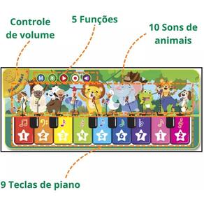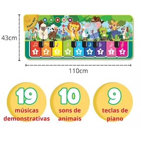 O Tapete Piano Musical Bichos possui 9 teclas de piano, 10 sons de animais e 19 músicas demonstrativas, este tapete interativo é perfeito para despertar a musicalidade! É possível explorar diferentes notas e sons, desenvolvendo o ouvido musical e ao tocar as teclas com os pés ou as mãos ajuda a melhorar a coordenação motora. Grave suas composições e reproduza sempre que quiser. Muito fácil de usar, basta colocar no chão, ligar e começar a tocar! 8 Sons de instrumentos 10 Teclas de Piano Funções de volume Botão Liga / Desliga 10 Musicas demonstrativas Contem 01 Tapete Piano Musical; 01 Chave philips; 01 Manual. Luz; Som; Música; Medidas: 110 cm x 43 cm Utiliza 3 pilhas AA não incluídas Composição: Plástico Selo segurança do inmetro Idade:01+ garantia 90 dias contra defeitos de fabricação