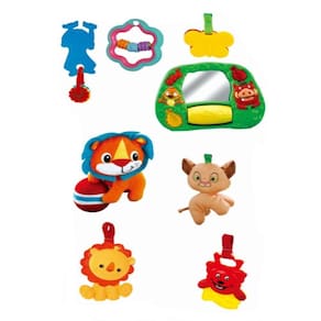 - Possui 8 tipos de brinquedos como mordedor, animais de pelúcia, chocalho e duas caixinhas musicais
