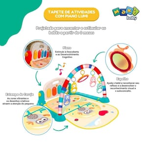 Tapete Ginásio De Atividades Para Bebê Piano Lumi Vd Maxi Baby Tapete Ginásio de Atividades Para Bebê Piano Lumi Maxi Baby Transforme o momento de brincar do seu pequeno com o Tapete de Atividades Baby da dm Toys. Este tapete musical é projetado para encantar e estimular os bebês a partir de 0 meses, oferecendo uma experiência única de aprendizado e diversão. Com luzes coloridas, sons envolventes e um tecladinho musical, ele estimula os sentidos e a coordenação motora do seu bebê, promovendo a exploração e a independência. Os brinquedos tipo móbile proporcionam uma interação divertida, enquanto as atividades variadas ajudam no desenvolvimento cognitivo e motor. A montagem é rápida e prática, ideal para pais que buscam conveniência. Com dimensões de 58 cm x 75 cm x 40 cm, este tapete é o espaço perfeito para o seu bebê se divertir enquanto aprende. Certificado pelo Inmetro, o Tapete de Atividades é seguro e durável, proporcionando tranquilidade para os pais. Não perca a oportunidade de oferecer ao seu filho um ambiente lúdico que favorece o desenvolvimento Adquira já o seu Tapete de Atividades e veja seu bebê se encantar com cada descoberta Principais características: - Idade Recomendada: A Partir de 0 Meses - Fácil de montar - Utiliza 2 pilhas AA Não Inclusas - Estimula o Desenvolvimento: Atividades que promovem a coordenação motora e a independência do bebê. - Interatividade: Luzes e sons que capturam a atenção do seu pequeno, incentivando a exploração. - Brinquedos Móbile: Diversão garantida com brinquedos suspensos que se movem e divertem. - Teclado Musical: Proporciona momentos de música e diversão enquanto o bebê brinca. - Fácil Montagem: Prático e rápido de montar, ideal para o dia a dia. Especificações Técnicas: - Conteúdo da Embalagem: 01 Tapete, 02 Bases de Suporte, 01 Teclado Musical, 02 Colunas de Suporte, 01 Arco, 05 Brinquedinhos Tipo Móbile e 05 Anéis - Composição/Material: Plástico - Dimensões do Produto Aberto: 58 cm x 75 cm x 40 cm - Peso Líquido: 700g - Certificação INMETRO 001422/2022 - : 30 Dias Contra Defeito de Fabricação Pelo Fabricante - Referência do Fabricante: 21716 / 21715 - EAN: 7899403217169 / 7899403217152 - Marca: Maxi Baby Imagens meramente ilustrativas, as cores e estampas podem variar de acordo com o lote do fabricante. Marca: Não Informado