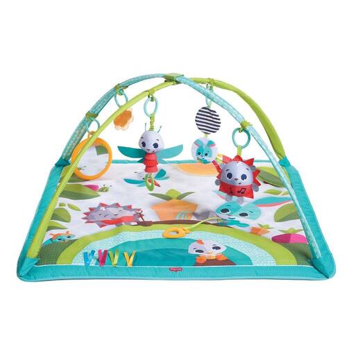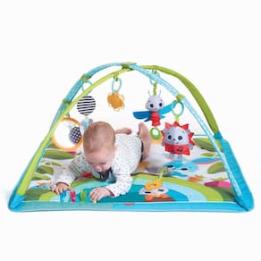 Tapete ginásio com arcos ajustáveis e 16 atividades sensoriais diferentes, incluindo brinquedo musical ativado pelo toque do bebê ou dos pais.