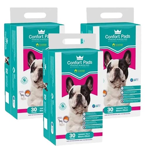 Tapete Higiênico 60x55cm Confort Pads C/30 Unidades - Indicado para cães; - Alta tecnologia; - Tecnologia com extra gel; - Máxima proteção contra vazamentos; - Tamanho 60x55cm. O Tapete Higiênico Confort Pads é indicado para cães de filhotes e adultos de pequeno porte. Ele possui uma alta tecnologia com extra gel, garantindo uma máxima proteção contra vazamentos. Confort Pads pode ser utilizado tanto em casa como em apartamentos. Desenvolvido com matérias de qualidade, resultando em um produto discreto, de fácil armazenamento proporcionando absorção na medida certa. Sua fabricação conta com 6 camadas de proteção e canais de absorção que garantem uma maior velocidade na absorção do xixi. Além disso conta com 4 fitas reposicionáveis. Modo de usar: Tire o tapete da embalagem. Desdobre-o. Retire os papéis aplicados nos 4 cantos da parte inferior do tapete e fixe-o no chão com o lado dos adesivos voltados para baixo.