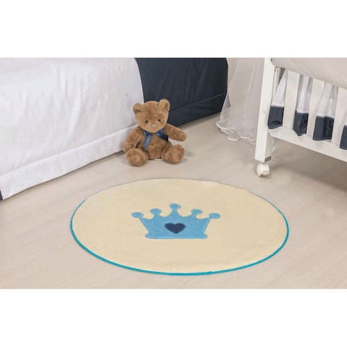 Tapete Infantil Quarto Bebê Pelúcia Coroa Baby Azul TurquesaComposição da superfície: pelúcia 100% poliésterComposição da base: feltro pontilhado com bolinhas de pvcAntiderrapanteMedidas: 78cm x 68cmAltura: 8 mmObs: objetos decorativos não acompanham o produto.