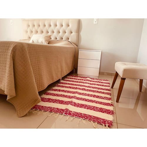 Tamanho: 0,80m x 1,50m A parte clara pode ser branca ou cru, dependendo da disponibilidade. Para que seu tapete se mantenha sempre lindo e confortável é necessário prestar atenção a alguns cuidados. Recomendamos a utilização de sabão líquido sem alvejante para lavagem das peças à máquina,sendo lavado na máquina não indicamos deixar de molho. Ao lavar, cuidado com o resíduo de sabão seco, pois ao sol causa manchas ao algodão. Portanto, enxague com bastante água, tirando todo o sabão. Para evitar manchas, é importante que a secagem seja feita à sombra. Em caso de manchas, remova o excesso com pano úmido ou papel toalha e lave imediatamente conforme instruções. Seguir as recomendações mantem a qualidade e a beleza das peças. Na hora da lavagem manual recomendamos água em abundância para retirar o sabão dos tapetes para que não haja risco da haver resíduos de sabão que na secagem podem causar dano à tonalidade do produto. Não recomendamos a lavagem de apenas uma parte do tapete em caso de contato com líquido ou sujeiras em locais pontuais, isso pode causar dano à tonalidade do produto. Por ser 100% artesanal ele pode sofrer variação na cor, tamanho e desenho, nada que afete a originalidade da peça. Os TAPETES ARTESANAIS estão super em alta na moda casa, além de serem produzidos com olhos voltados para sustentabilidade, eles geram renda para diversos artesãos no interior. O tramado de cada TAPETE é ÚNICO. Os produtos são funcionais e práticos conforme o cenário dos novos tempos exige Os TAPETES são feitos com resíduos têxteis, deixam qualquer ambiente mais aconchegante, são de fácil manejo na hora de lavar, e sua característica mais forte além da beleza é a durabilidade. As peças seguem tendências em cores, e desenhos. Uma diversidade enorme de modelos vai te encantar. Minimalista, nórdica, escandinava, industrial, rústica, colorida, moderna, boho, monocromática, hygge seja qual for a inclinação de decoração que sua casa segue, certamente ele irá combinar com sua casa. Os tapetes podem encolher após a primeira lavagem.
